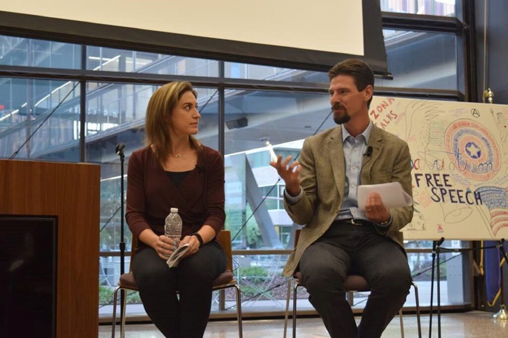 Goldwater Institute experts Christina Sandefur and Jim Manley discuss the state of free speech on college campuses at Tuesday’s Arizona Talks panel event. (Source: Arizona Talks Facebook page.)