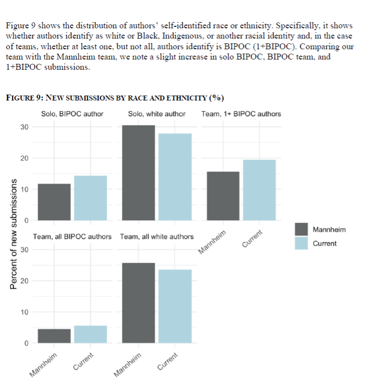 The Feminist Collective continued to analyze the race and sex of authors who submitted to the APSR in subsequent annual reports.[xxviii] In a 2023 update, the editorial team reported that it had succeeded in increasing the number of “women, BIPOC and LGBTQ scholars” who published articles in the APSR.[xxix]
