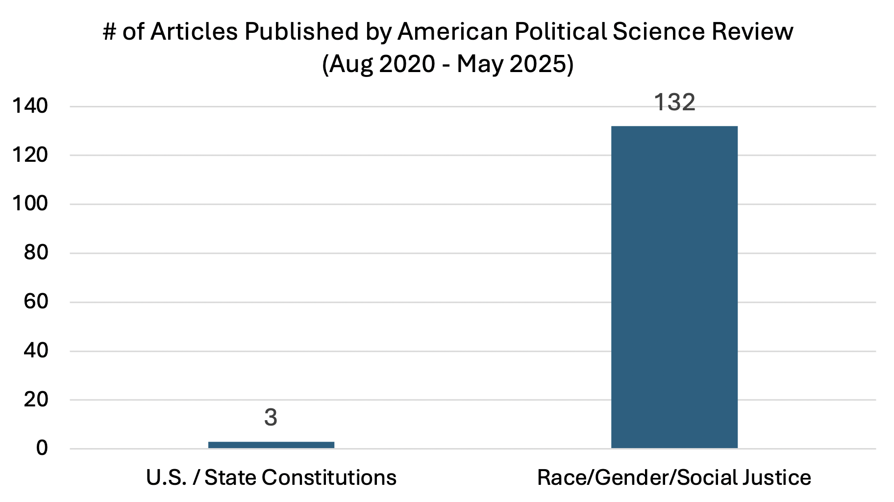- Thanks to the APSR’s editorial manipulation, from 2020-25, only three APSR articles (less than 1% of the total articles published) specifically focused on the U.S. Constitution or the 50 state constitutions. The number of articles focusing on race, gender, and/or social justice was more than 40 times greater than the number focused on American constitutions, with nearly one-quarter of all APSR published articles examining race, gender, systemic oppression, or related topics.